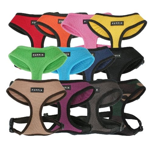 Disse hundeseler i stof fra Puppia fås i flere farver .