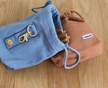 Godbidstaskerne rummer naturligvis plads til hundesnacks, og samtidig er de udstyret med en karabinhage, som gør den nem at påføre en hundesnor eller bukserne.