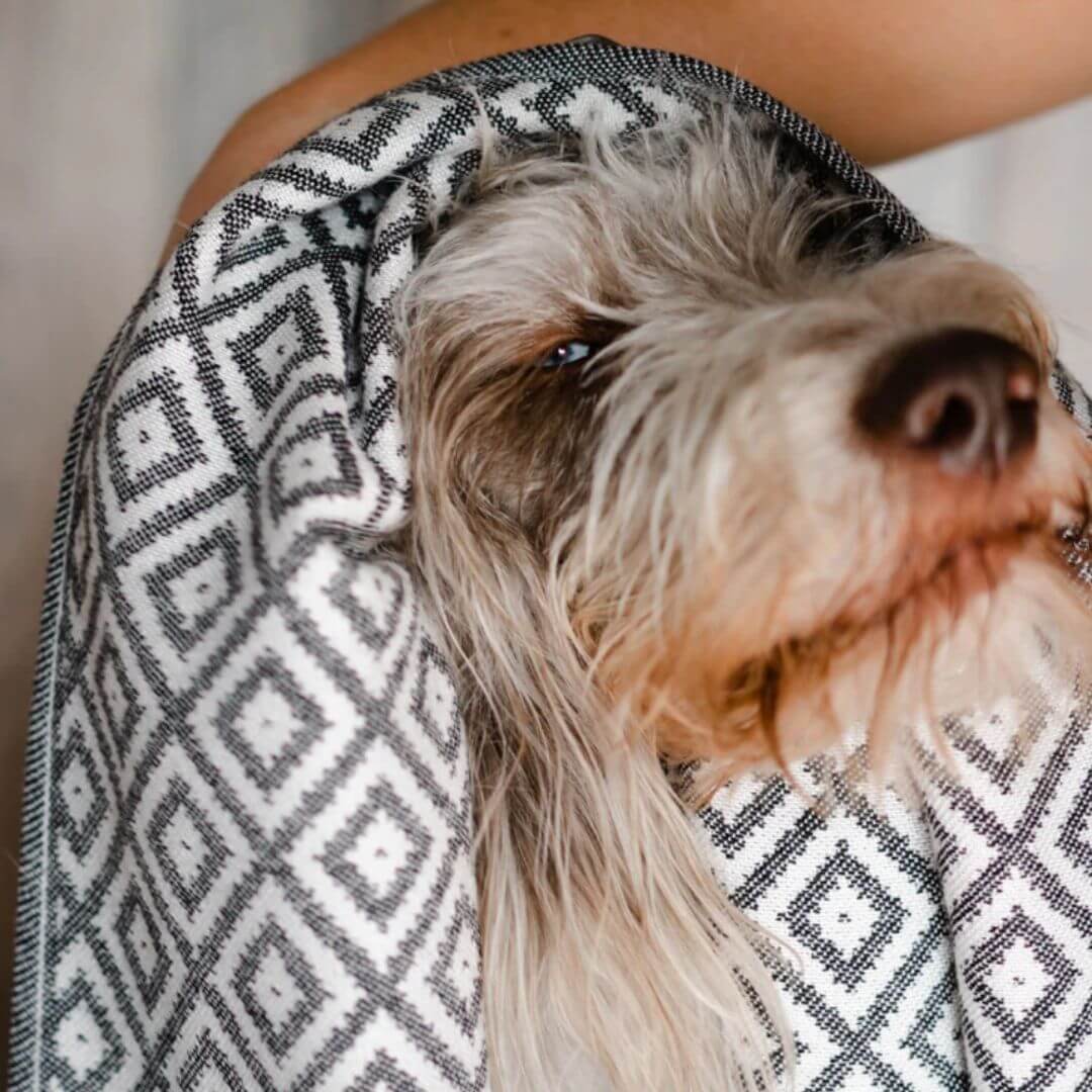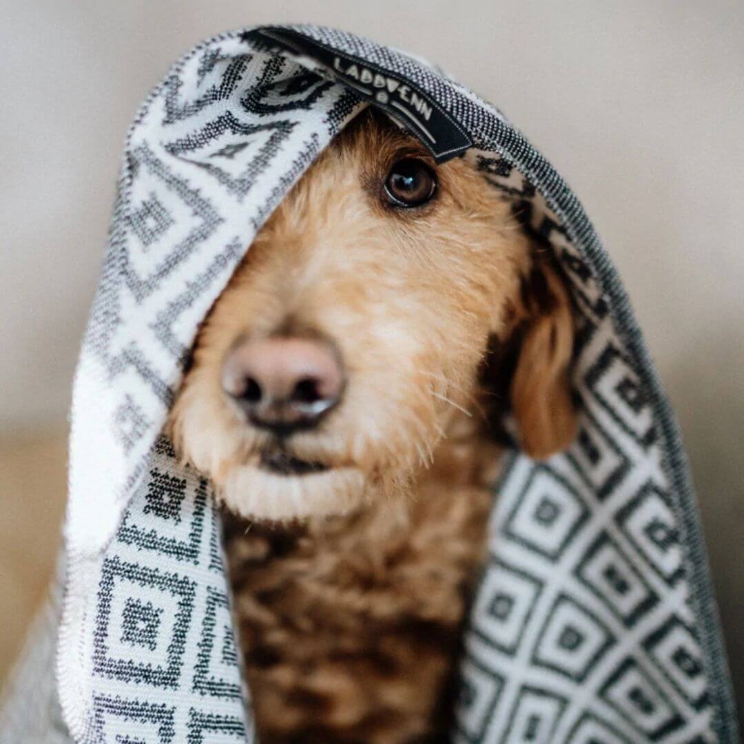 Labbvenn´s Linaa håndklæde til hunde, har et unikt mønster, er elegant og smukt, og det tåler at ligge fremme, selv efter brug.